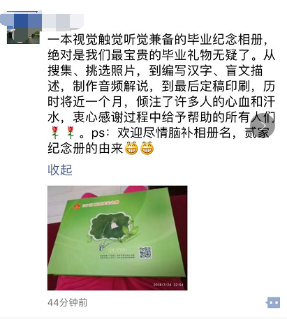 感謝所有為“盲文畢業(yè)紀(jì)念冊”做出奉獻(xiàn)的人,因為你們,世界更美麗。掃描封面二維碼,聆聽2018屆貳家畢業(yè)班同學(xué)的校園故事,不知不覺,熱淚盈眶,感動之余,我明白了“讓印刷走進(jìn)千家萬戶,為幸福生活添色加彩”的真實(shí)含義。